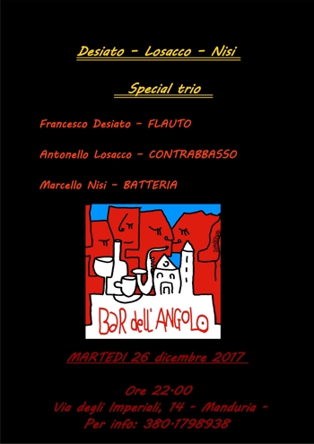 degli Imperiali, 14 – Manduria), Desiato-Losacco-Nisi Special Trio, inedita formazione pianoless costituita da Francesco Desiato (flauto), Antonello Losacco (contrabbasso) e Marcello Nisi (batteria), proporrà un repertorio incardinato su alcune perle compositive autografate da John Coltrane e Charles Mingus, vere e proprie icone sacre del jazz, nonché qualche brano siglato da altri leggendari musicisti di questo genere. Desiato è uno fra i più interessanti e creativi flautisti jazz italiani. Il suo stile è improntato su un particolare utilizzo dell’humming, di tipo contrappuntistico. Profondo ricercatore del suono, in possesso di un vivido estro armonico e incline alla sperimentazione, nell’arco della sua carriera ha condiviso palco e studio di registrazione insieme a uno stuolo di jazzisti di rango internazionale, tra i quali: Bobby Durham, Karl Potter, Tony Monaco, Ray Mantilla, Francisco Mela, Irio De Paula, Paul McCandless, Bobby Watson, Rick Margitza, Roberto Gatto, Stefano Bollani, Rosario Giuliani, Fabrizio Bosso, Luca Aquino, Dario Deidda, Massimo Faraò, Roberto Tarenzi, Flavio Boltro, Gegè Munari, Giorgio Rosciglione. Le sue qualità artistiche sono state apprezzate anche fuori dai confini italici, come, ad esempio, in Lituania e Giordania.