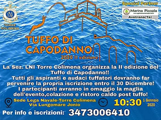 La “goliardata tutto cuore” ha ormai inserito di diritto Brindisi nell’elenco delle città mondiali che festeggiano in maniera eccentrica il primo giorno dell’anno nuovo, una tra le poche a prevedere in ogni edizione la raccolta di fondi da devolvere totalmente in beneficienza. Ogni anno adulti, over, ma anche giovanissimi regolarmente autorizzati dai genitori, si danno appuntamento per accogliere il nuovo anno con il primo tuffo in mare. Una maniera alternativa di festeggiare il capodanno, aperta alla partecipazione di tutta la cittadinanza e spettacolo unico ed imperdibile per quanti vi assistono come spettatori. Prosegue inoltre il “Gemellaggio Morale” della manifestazione brindisina con il Tuffo di Capodanno – Città di Viareggio, organizzato in toscana dalla Asd Escape Tuscany Triathlon, che ha ideato l'ormai ‘famosa’ cuffia con il motto “Hai Freddo?…STAY HOME”.