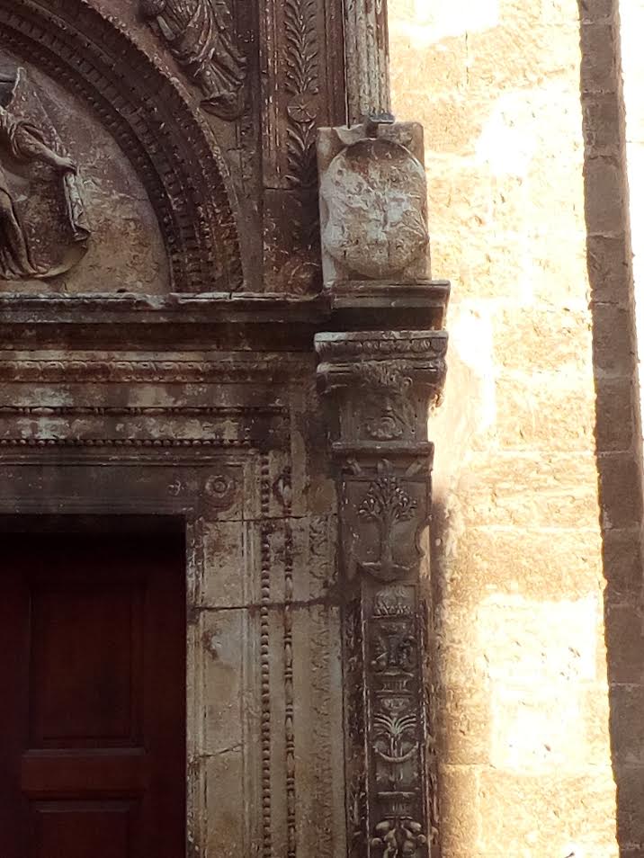 La serie di stemmi del portale risulta però ridotta all’essenziale: in basso i due stemmi gemelli dell’Università di Casalnuovo (l’amministrazione civica dell’epoca) titolare dello jus patronatus della chiesa; in alto a destra (o, rispetto a chi guarda, a sinistra), l’emblema dei Bonifacio-Cicara, la famiglia feudataria di Casalnuovo-Manduria, e, a sinistra (a destra, per l’osservatore), lo scudo che allo stato si presenta particolarmente usurato e del quale, in questa sede, ho appena proposto l’attribuzione alla Chiesa parrocchiale.