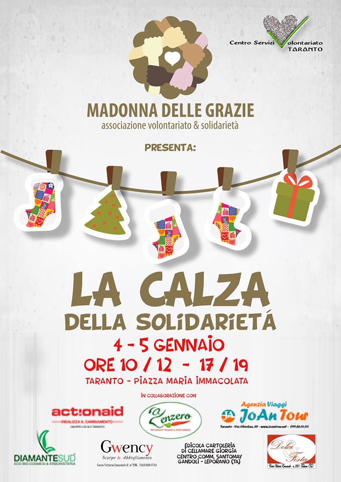 L’associazione di volontariato e solidarietà “Madonna delle Grazie” organizza l’iniziativa benefica “La Calza della Solidarietà” che, in questa terza edizione, gode del patrocinio del Centro Servizio Volontariato di Taranto e dell’Amministrazione comunale di Taranto.