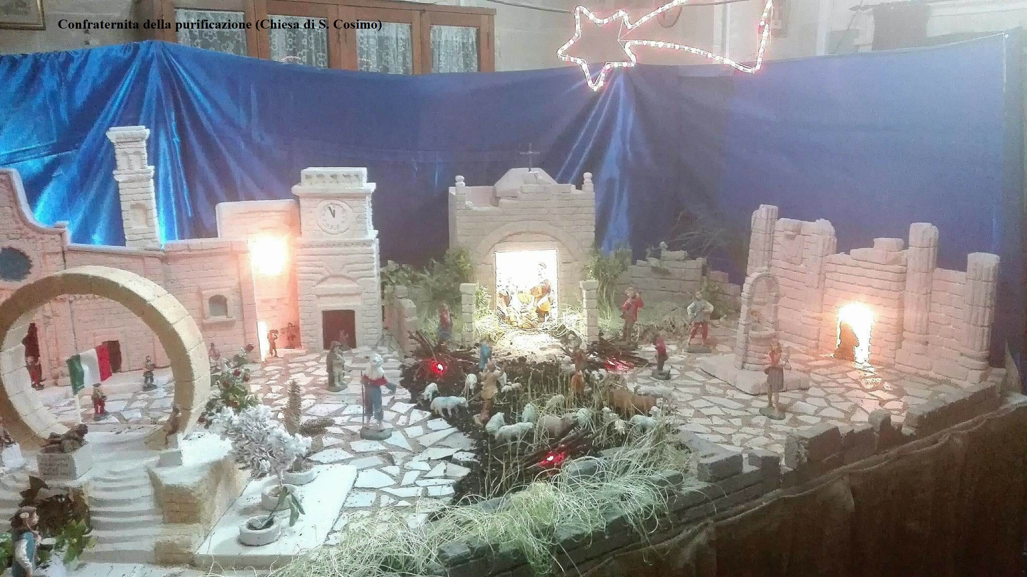Nella seconda categoria, quella delle chiese, si è attestato al terzo posto il convento di S. Paolo della Croce, la cui rappresentazione si estende sorprendentemente su grande scala anche a momenti di vita quotidiana. Al secondo posto il convento di San Francesco, che ha ambientato la nascita di Gesù Cristo in un contesto urbano tipicamente mediteranno. Sul gradino più alto del podio si è posizionato il presepe della confraternita della Purificazione (Chiesa di S. Cosimo) che fa rivivere la nascita del Salvatore tra gli edifici storici ed i monumenti della nostra Manduria (foto in basso).