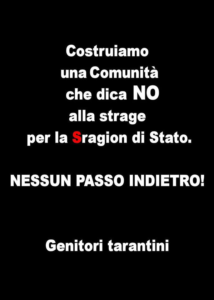 “Costruiamo una comunità che dica NO alla strage per la Sragion di Stato. Nessun passo indietro”. Questa è la frase che richiama alle proprie responsabilità il Governo della nazione, da sempre disattento ed incurante della salute dei cittadini, dell’ambiente e del futuro di Taranto.