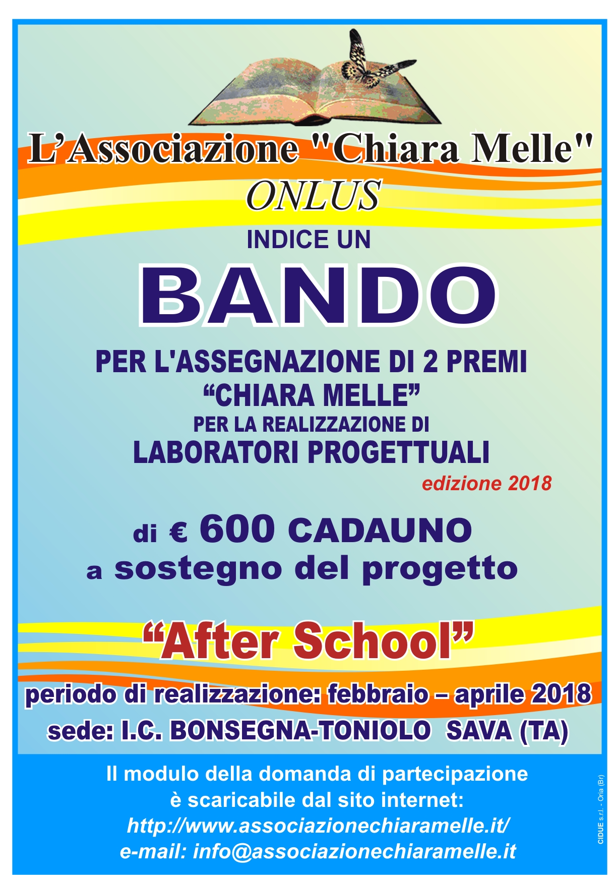 L’associazione “Chiara Melle” mette a disposizione due premi per realizzare questi laboratori progettuali nel periodo febbraio-aprile 2018.
