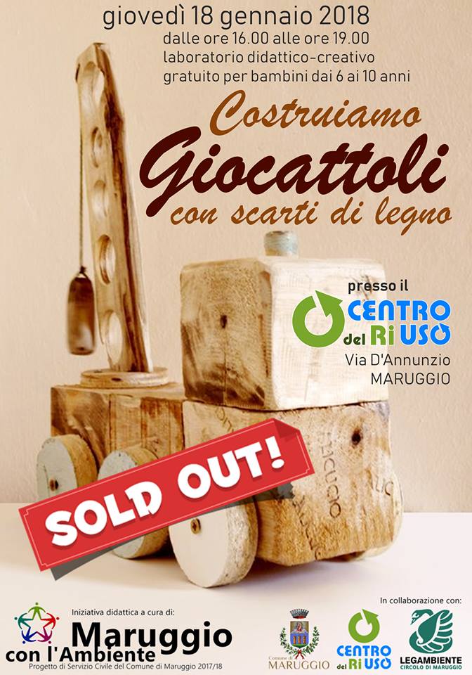 saranno costruiti dei giocattoli con scarti di legno. Sarà curato del Servizio Civile del Comune di Maruggio, in collaborazione con Legambiente e Centro del Riuso, e partirà da giovedì 18 gennaio. Si svolgerà, dalle 16 alle 19, presso i locali del “Centro del riuso” di via D’Annunzio.