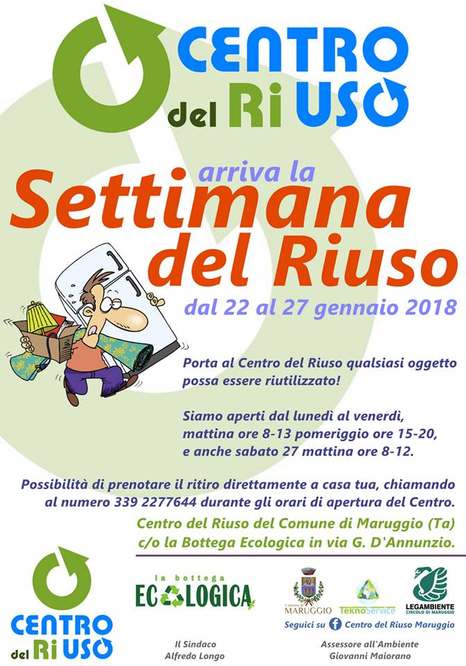 Sarà l’occasione giusta per conferire beni in buono stato e riutilizzabili. E’ questo l’obiettivo dell’iniziativa denominata “Settimana del Riuso” e promossa dall’assessorato all’Ambiente e Ecologia del Comune di Maruggio in collaborazione con la TeknoService e con i volontari del circolo Legambiente Maruggio.