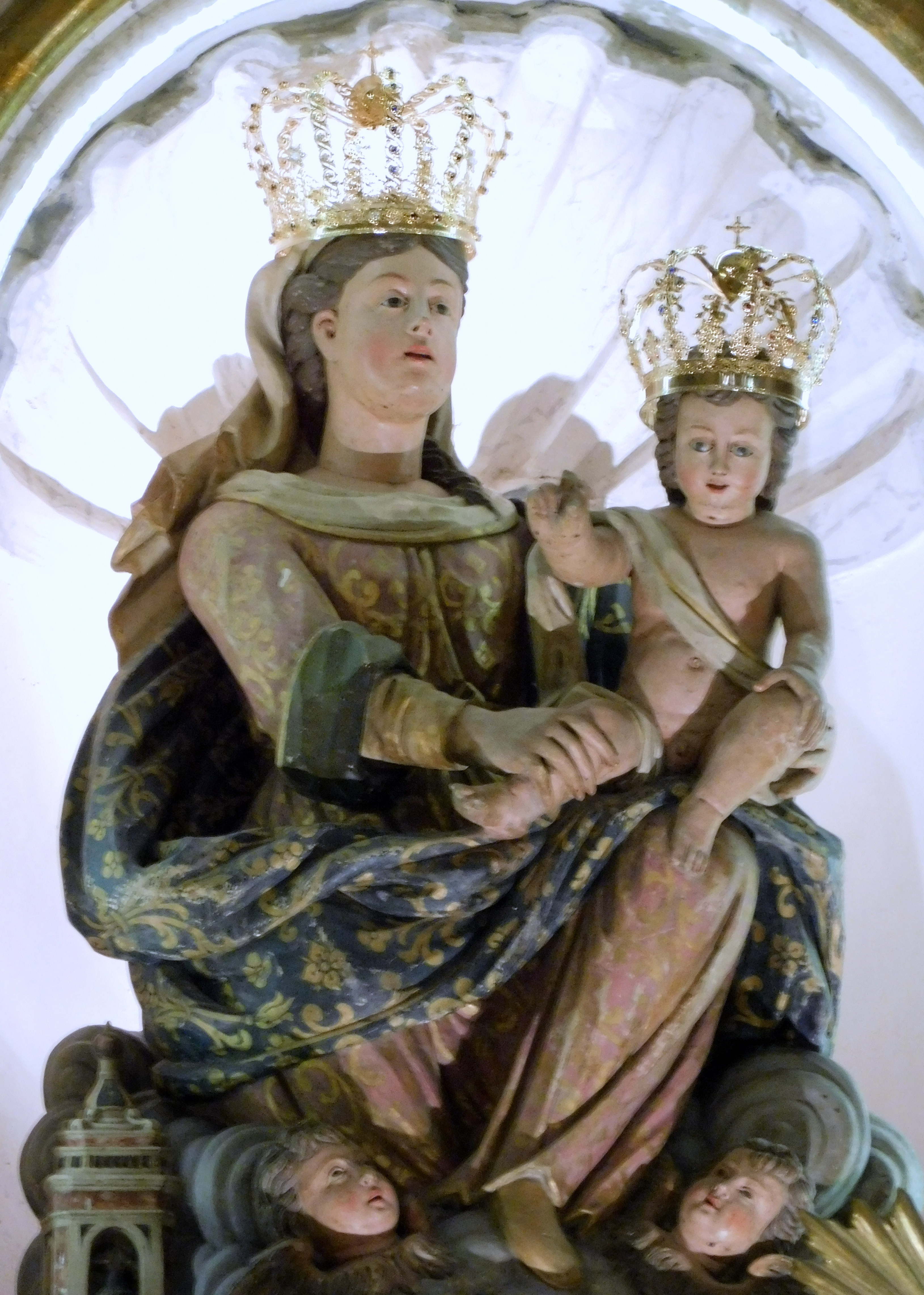 La statua in pietra policroma, graziosa, anche se invero collocata in posizione piuttosto appartata, è invece opera di autore ignoto, forse locale, ed è fatta risalire, col conforto documentario, al 1725, anno della consacrazione della chiesa. Si tratta di una scultura di intonazione devota: la Madonna,dalle fattezze spiccatamente popolari e dallo sguardo fermo, regge in braccio il Bambino, che si rivolge all’osservatore con gesto benedicente. Ella indossa velo bianco, tunica rossa e mantello azzurro, questi ultimi caratterizzati dalla presenza di una decorazione floreale dorata, che pare imitare, in modo semplificato, il ricco “estofado ” delle coeve sculture lignee barocche, di cui nelle chiese manduriane è apprezzabile più di un esempio.