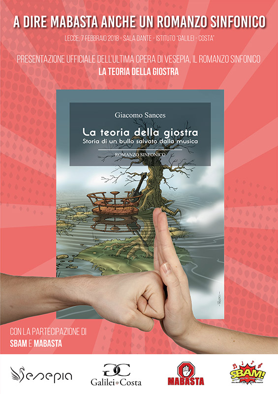 contro il Bullismo e Cyberbullismo, i giovani studenti animatori del movimento “Mabasta”, insieme all’autore Giacomo Sances e alla casa editrice “Vesepia”, presenteranno al pubblico, alla stampa e, soprattutto, a oltre 200 studenti della scuola secondaria di primo e secondo grado il nuovo Romanzo Sinfonico dal titolo “La teoria della Giostra – Storia di un bullo salvato dalla musica”.