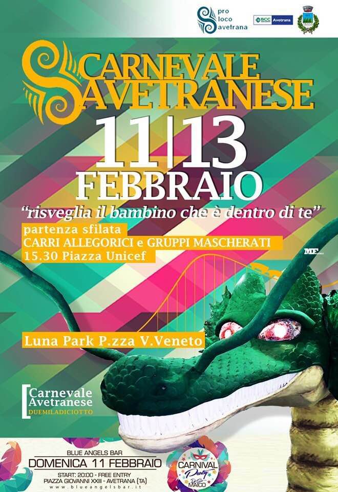 Doppio appuntamento per l’attesissimo Carnevale Avetranaese, giunto alla ventunesima edizione. Promosso, come ogni anno, dalla Pro Loco di Avetrana,