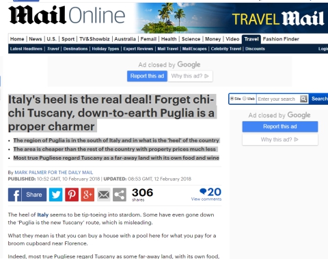 Un elogio alla Puglia a dispetto della Toscana. Quello del celebre tabloid inglese, the Daily Mail, è un vero e proprio spot per la nostra regione dedicando un articolo della sua edizione on line al tacco d'Italia con un occhio di riguardo alla Valle d'Itria. L'articolista della testata britannica, cita Ostuni tra le mete imperdibili, insieme a Lecce e Cisternino. Nel suo racconto - che viene pubblicato nella sezioni viaggio della versione on line del Daily Mail - il giornalista si lascia andare in descrizioni minuziose che riguardano la bellezza della nostra regione, esaltandone i luoghi, la gastronomia e soprattutto la convenienza economica. Un esempio su tutti: con quanto pagate con una cena a Ostuni, a Firenze non paghereste neanche un antipasto.