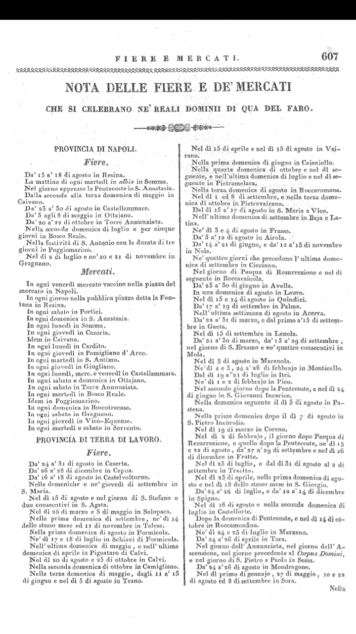 Per completezza, preciso che al primo bollettino segue l’altro intitolato“Nota delle fiere e de’ mercati che si celebrano ne’ reali domini oltre il Faro” che riguarda, appunto, la parte insulare del Regno, ossia la Sicilia.