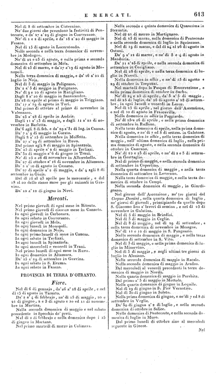 A pag. 613 del bollettino, alle voci “Provincia di terra d’Otranto”, “Fiere”, è scritto: “Da’ 9 a 12 di marzo, e ne’ dì 3 e 4 di agosto in Manduria”. Vengono così ufficializzati i giorni in cui, all’epoca, era autorizzato lo svolgimento delle due fiere locali: quella primaverile denominata di San Gregorio (o anche Pessima) e quella estiva di San Domenico.