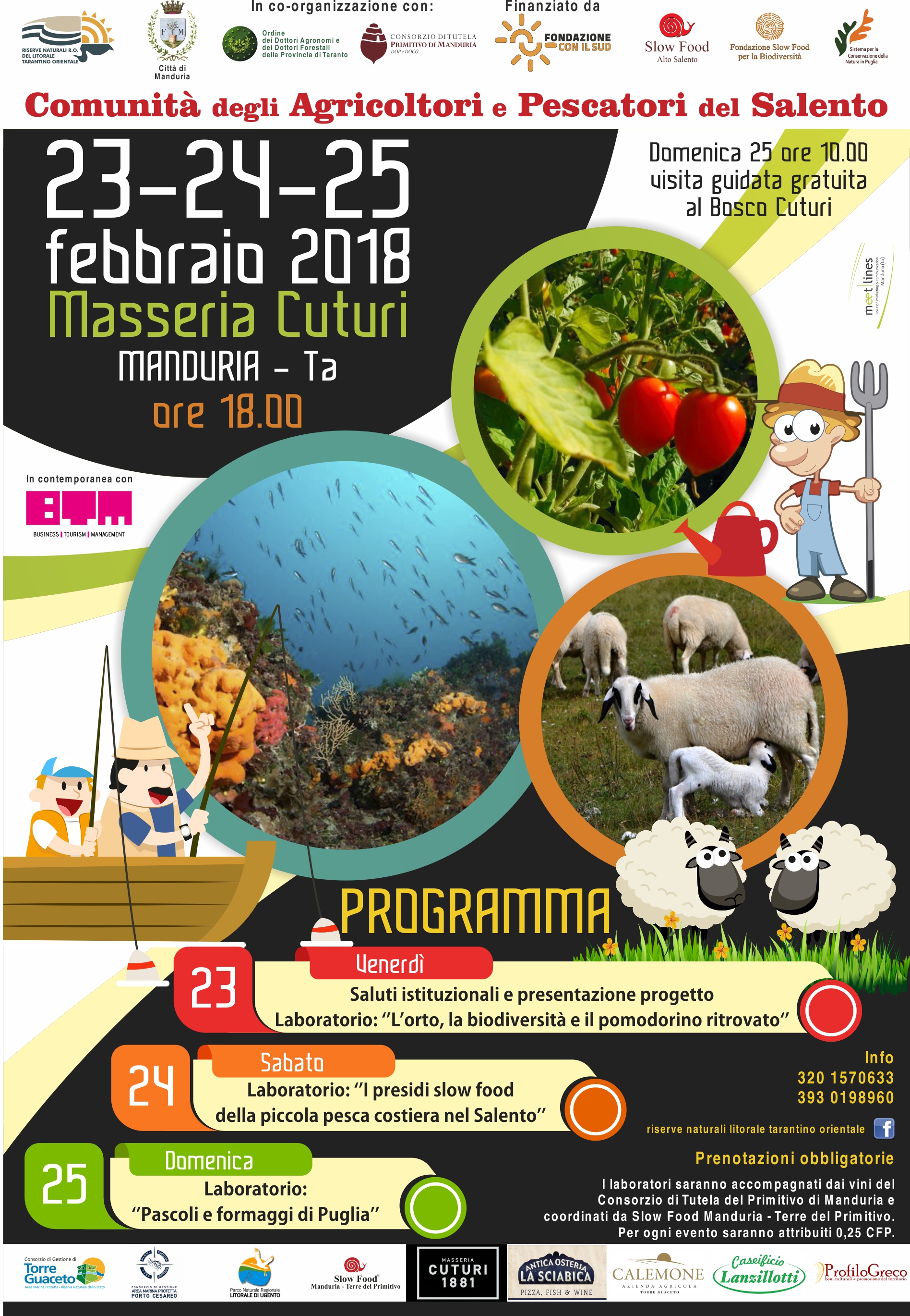 Palcoscenico dell’iniziativa sarà la splendida masseria Cuturi, che aprirà la manifestazione questa sera con i saluti istituzionali di Francesca Adelaide Garufi (Commissario Straordinario del Comune di Manduria e Autorità di Gestione delle Riserve Naturali), di Gianluca Buemi (Presidente Ordine degli Agronomi Taranto), di Adriano Pasculli De Angelis (Direttore Consorzio di Tutela del Primitivo), di Angelo Massaro (Fiduciario condotta Slow Food Alto Salento – capofila di progetto). Seguiranno gli interventi degli esperti: Alessandro Ciccolella (Direttore Consorzio di Gestione di Torre Guaceto) e Alessandro Mariggiò (direttore delle Riserve Naturali R.O. del Litorale Tarantino Orientale). Il laboratorio del gusto sarà a cura di Mario di Latte - ditta Calemone, custode del pomodorino fiaschetto di Torre Guaceto.