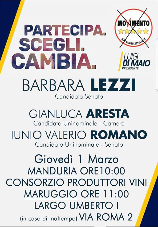 giovedì 1 marzo alle ore 10:00 presso il Consorzio Produttori Vini, nel quale i candidati di Camera e Senato: Barbara Lezzi, Gianluca Aresta e Iunio Valerio Romano esporranno il programma di governo del M5S» è riportato in una nota del meetup Manduria 5 Stelle.