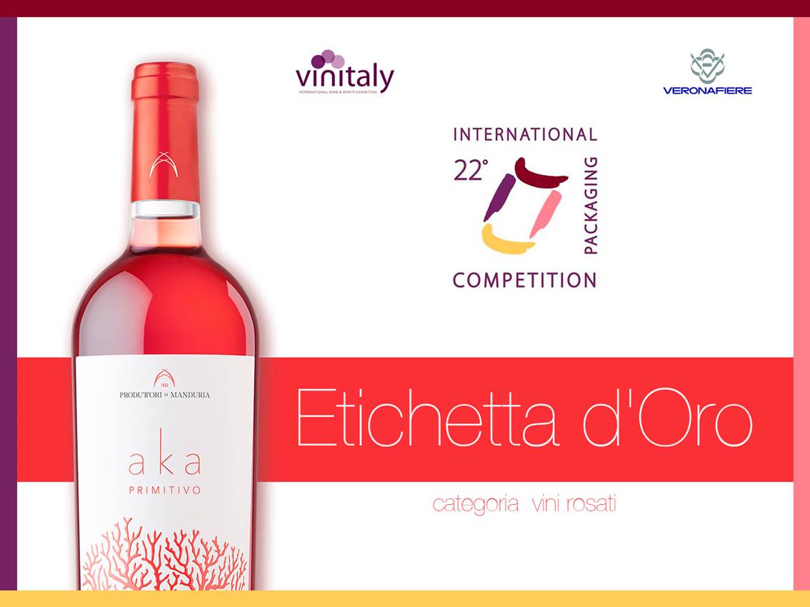 Il Salento igp Primitivo rosato “Aka”, annata 2017, si è aggiudicato il riconoscimento “Etichetta d’oro” per la categoria numero 3 (confezioni di vini rosati tranquilli a denominazione di origine e a indicazione geografica) del concorso internazionale “Packaging”, competizione internazionale di Veronafiere, legata a Vinitaly ed Enolitech. La premiazione della cantina Produttori di Manduria avrà luogo il 15 aprile prossimo, durante la fiera “Vinitaly”, presso la sala Puccini.