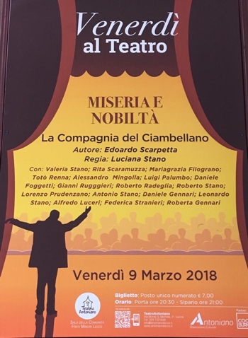al teatro” del teatro Antoniano di Lecce. Riproporrà la celebre commedia in tre atti di Eduardo Scarpetta “Miseria e Nobiltà”, già presentata, con successo, a Manduria nel dicembre scorso.