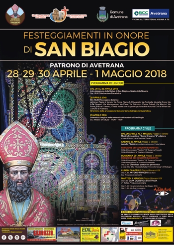L’evento, che avrà luogo nei giorni 28-29-30 aprile e 1° maggio 2018, organizzato con meticolosa cura dal Comitato, con il patrocinio dell’Amministrazione Comunale, sotto l’egida della Banca di Credito Cooperativo di Avetrana e con l’aiuto consolidato dei numerosi partners e non di meno dell’intera cittadinanza, prevede una mostra fotografica denominata “Come Eravamo” a cura di Bruno Leo e Samuele Ferrara, l’annullo filatelico della cartolina di S. Biagio, con la partecipazione degli alunni dell’Istituto Comprensivo M.Morleo” di Avetrana, a cura di Poste Italiane, i concerti dei rinomati complessi bandistici di Conversano “Piantoni” , Rutigliano e Bracigliano, nonché il grandioso spettacolo pirotecnico della ditta “Bruscella Italian Fireworks Group” di Modugno, le luminarie a ritmo di musica con tecnologia “RGB” curate dalla ditta “Mariano Lights” di Corigliano d’Otranto, oltre al concerto di musica leggera di “Antonio Furioso Live Show Tour Arenarock” e del famoso gruppo di pizzica “Alla Bua”.