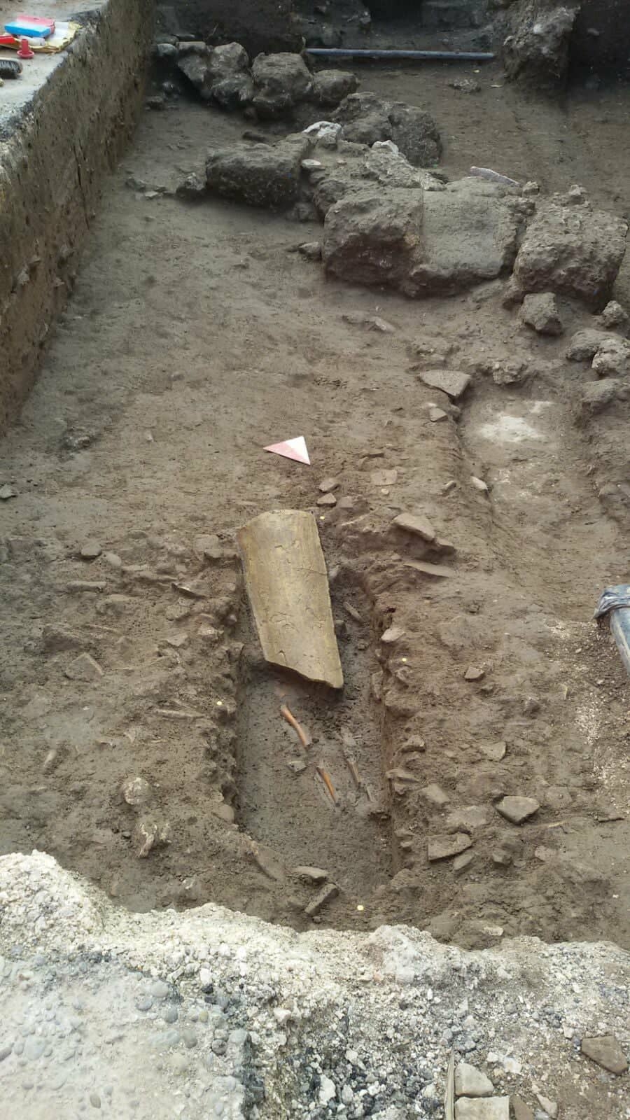 Gregorio Tarentini. Durante lo scavo, in atto nei pressi della piazzetta antistante l’ingresso del parco archeologico, gli operai, guidati dall’archeologa Patricia Caprino, hanno rinvenuto i resti di un bambino, il cui capo era coperto da una tegola.