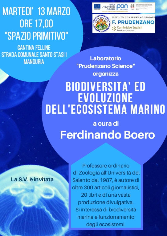 Parlerà di “Biodiversità ed evoluzione dell’ecosistema marino”. L’incontro promosso dalla dott.ssa Giulia Merico nell’ambito del progetto “Prudenzano Science” dell’istituto comprensivo “Prudenzano”