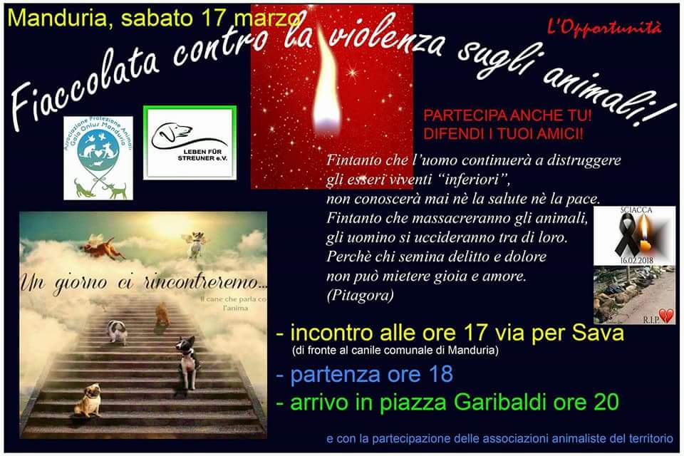 Questa sera si terrà una fiaccolata in onore di tutte quelle povere creature morte avvelenate a Sciacca e per tutte quelle anime vittime di crudeltà da parte dell’uomo. Il corteo partirà dal piazzale antistante il canile sanitario di Manduria (via x sava) e proseguirà per diverse vie del paese fino ad arrivare in Piazza Garibaldi...