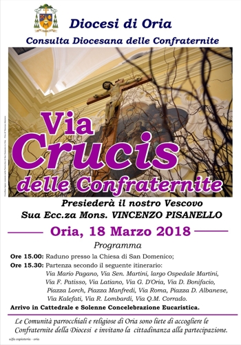 Alla Via Crucis, presieduta dal vescovo di Oria mons. Vincenzo Pisanello e promossa dalla Consulta diocesana delle Confraternite, parteciperanno tutte le confraternite provenienti dai vari comuni della diocesi.