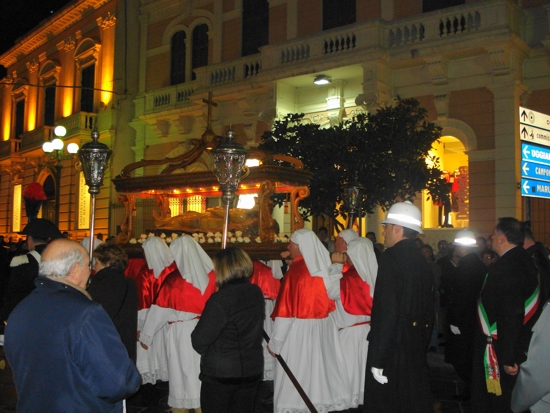 Soltanto dopo, al momento dell’uscita solenne di Cristo Morto e della Madre dal portale principale del Duomo, salutati dalla marcia funebre improvvisamente intonata dalla banda civica, la grande processione si snoderà per le principali vie cittadine, seguendo uno dei due itinerari prestabiliti, percorsi ad anni alterni.