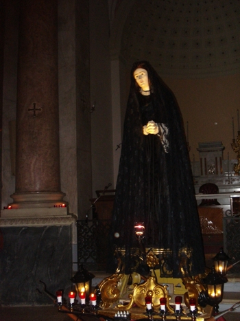 Il corteo, però, non avrà inizio se prima non avrà fatto il suo ingresso, nella Chiesa Collegiata, rischiarata dall’ultima luce del giorno che cade livida sull’antica facciata, la Madre Dolente, Maria Ss.ma Addolorata, accorsa per visitare il Figlio.