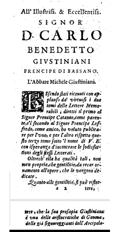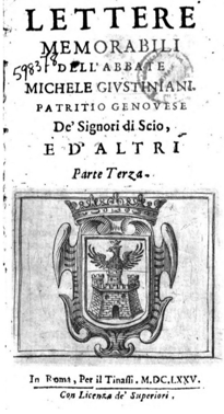 finanziare la stampa di opere letterarie (soprattutto se provenienti da esponenti di altri rami dell’antico casato Giustiniani) sembra trovare conferma nella dedica contenuta in una edizione delle Lettere memorabili scritta dal noto abate genovese Michele Giustiniani (autore anche delle altre due più celebri opere dedicate agli scrittori liguri e ai diciotto fanciulli Giustiniani martirizzati dai Turchi durante la conquista di Chio). La parte terza dell’opera dello scrittore che si definisce sempre “Patritio genovese de’ Signori di Scio”, stampata “In Roma, per il Tinassi, MDCLXXV” (1675), innalza nel frontespizio lo stemma della casata e nella pagina successiva contiente la dedica al finanziatore Principe Carlo Benedetto Giustiniani di Bassano (lo stesso della ristampa del nostro libretto) cui l’opera è indirizzata anche in ragione delle sue “qualità gentilizie” (leggasi parentela) atteso che “…la sua prosapia Giustiniana è una delle più aristocratiche di Genova delle già signoreggianti dell’Arcipelago (egeo) e delle presenti baronali di Roma”.