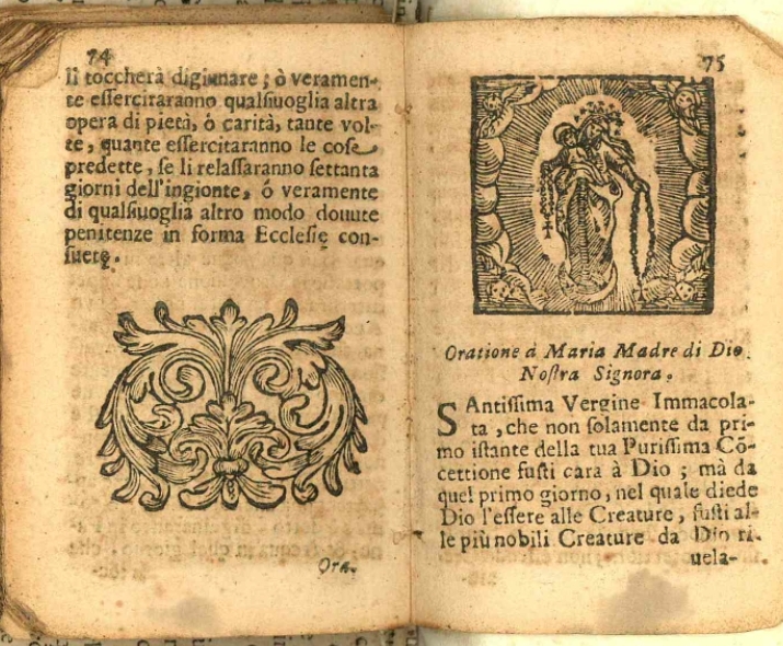 Il documento, del quale ero venuto a conoscenza grazie alla consultazione dell’Indice dei libri proibiti, è stato materialmente rinvenuto presso l’archivio romano della Congregazione per la Dottrina della fede (ex Sant’Uffizio) e, in attesa di poterlo consultare de visu, anticipo il contenuto della copertina che ne contiene i principali elementi identificativi: “Gratie concesse da Maria Nostra Signora Immaculata a molti divoti del digiuno per pane & acqua in honore della sua purissima Concettione, col modo di fare detto digiuno perpetuo, Indulgenze concesse dalla Santità di Clemente X. Fatta ristampare per ordine dell’Eccellentiss. Sig. D. Carlo Benedetto Giustiniani Prencipe di Bassano. Ad istanza del P. Bonaventura a Bagnaia Predicator Cappuccino.”. Segue l’indicazione dello stampatore: “In Ronciglione, per il Menichelli, Con Lic. de’ Sup. 1679”. Il libro di dimensioni molto ridotte e di formato in sedicesimo è inserito in un fascicolo nel quale vi sono altri documenti riguardanti il digiuno perpetuo dell’Immacolata (2).