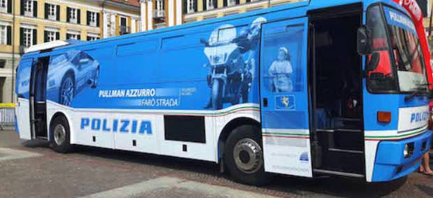 A Sava il pullman azzurro della Polizia di Stato.