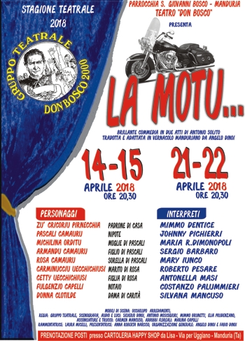 oggi e domani e, poi, il prossimo fine settimana (21 e 22 aprile), interpreteranno, nel teatro “Don Bosco” dell’omonima parrocchia, il lavoro “La motu”, commedia brillante in due atti di Antonio Solito, tradotta e adattata in vernacolo manduriano da Angelo Dinoi.