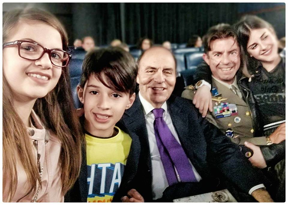 “Il Colonnello” arriva al cinema Palma in uniforme: la tonnellata di farmaci che deve prendere ogni giorno (quotidianamente circa 4 ore di flebo e circa 300 compresse!) non gli impediscono di essere elegante e di sembrare in forma, quasi più giovane dei suoi 50 anni, se non fosse per le cannule che gli entrano nelle narici. Lo accompagnano il regista e l’operatore J. Ferreira che l’hanno seguito tre mesi per le riprese nel Salento, dove abita, e a Caposile, in Veneto, per le riprese con l’elicottero. Lo accoglie Claudia Maciucchi, il sindaco di Trevignano e tra gli ospiti d’onore ufficiali delle Tre Armi, essendo il film realizzato con la collaborazione del Ministero della Difesa.