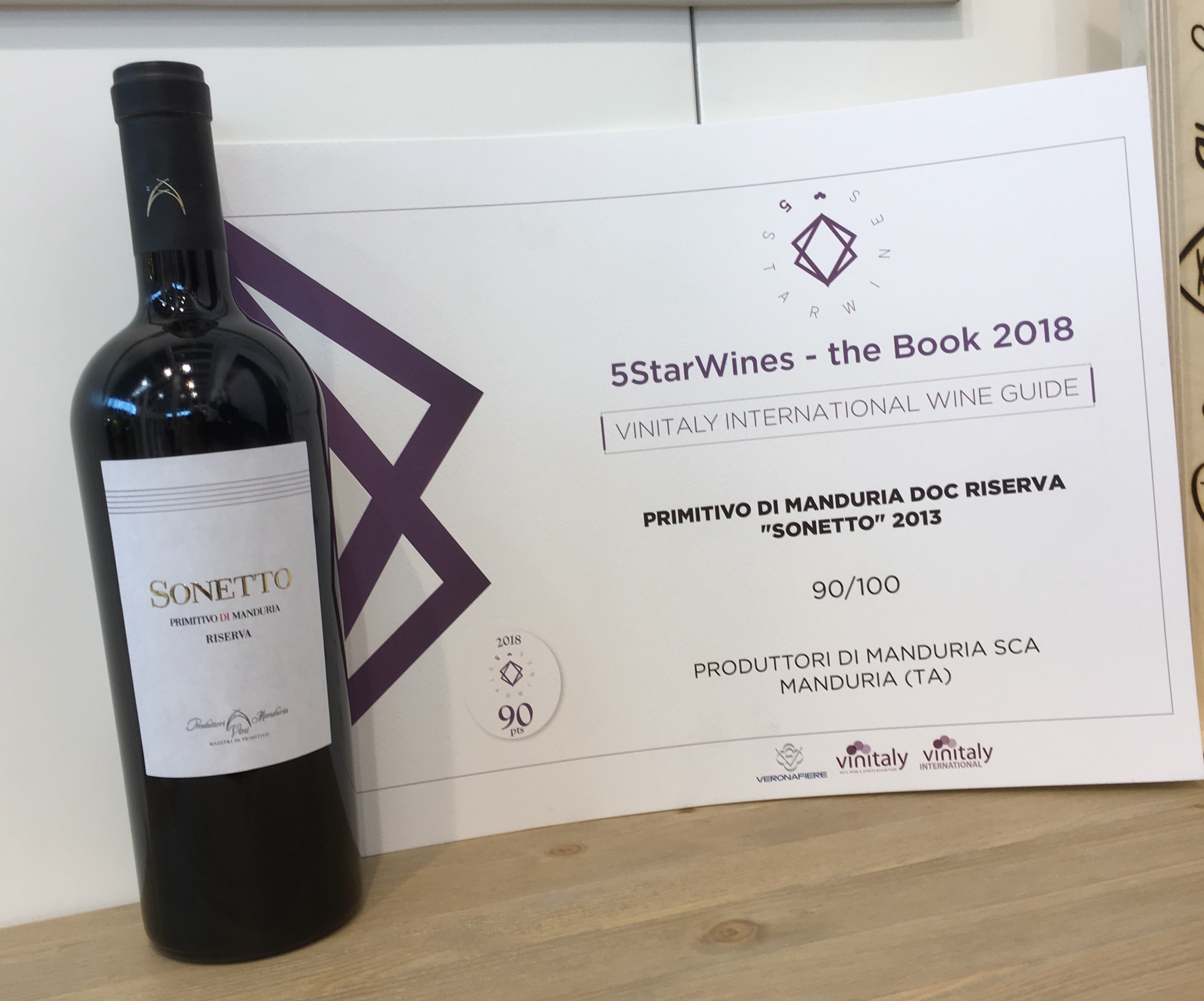 Ma le soddisfazioni per i Produttori di Manduria non sono terminate qui. Il vino Sonetto, Primitivo di Manduria Doc Riserva annata 2013, è risultato fra i selezionati (quindi con almeno 90 punti ottenuti dalla commissione) del concorso “5StarWines”, il più importante del Vinitaly. Sono cinque i vini di Primitivo che hanno ottenuto il riconoscimento: si tratta di due doc e tre dop. Il “Sonetto” è l’unico Primitivo di aziende manduriane.