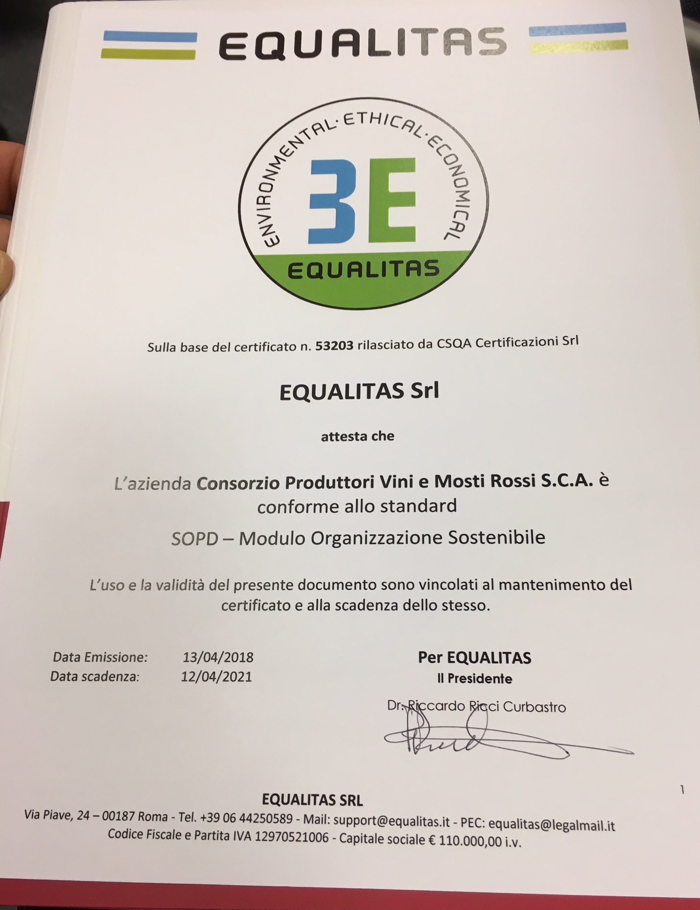 certificazione Equalitas, creata per definire uno standard di sostenibilità della vitivinicoltura, dal territorio al prodotto, passando per l’azienda, nel rispetto delle dimensioni economiche, sociali e ambientali.
