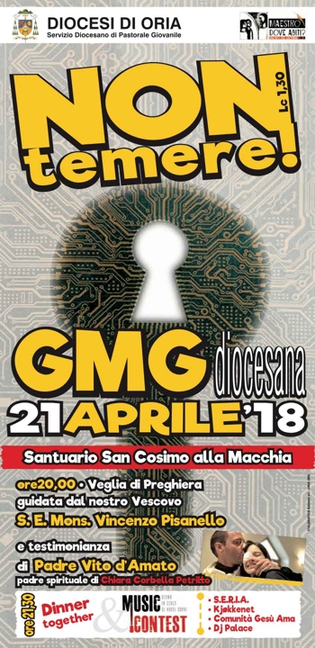 Contestualmente al cammino del Sinodo dei Giovani, incentrato sulla tematica di fede e discernimento vocazionale, la GMG diocesana quest’anno coincide con la 55esima giornata mondiale delle vocazioni, divenendo cosi un buon “pit stop” per il cammino che i giovani della nostra Diocesi quest’estate percorreranno fisicamente insieme ai coetanei delle Diocesi di Katowice (Polonia) e di Scutari (Albania), con le cui comunità la Diocesi di Oria ha realizzato iniziative di gemellaggio.