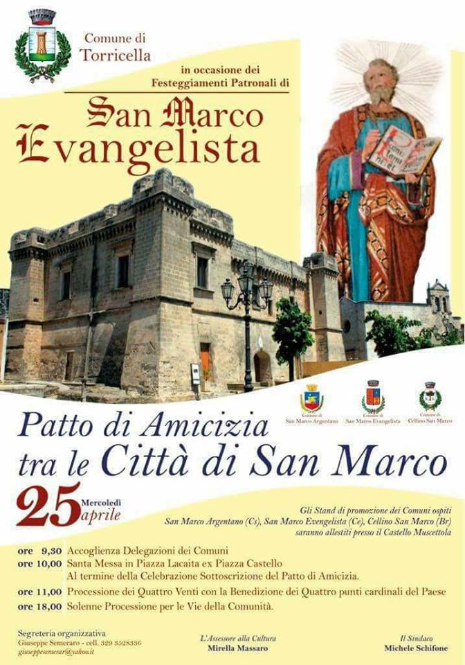 In occasione della festa patronale in onore di San Marco Evangelista, domani a Torricella è in programma la cerimonia di sottoscrizione del Patto di Amicizia tra le