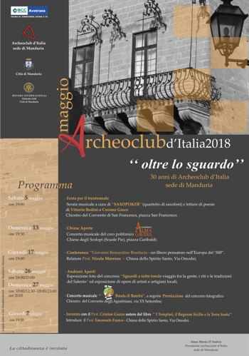 Come ormai da diversi anni, Archeoclub d’Italia – sede di Manduria propone la tradizionale iniziativa del “Maggio Archeoclub” con una serie di manifestazioni volte
