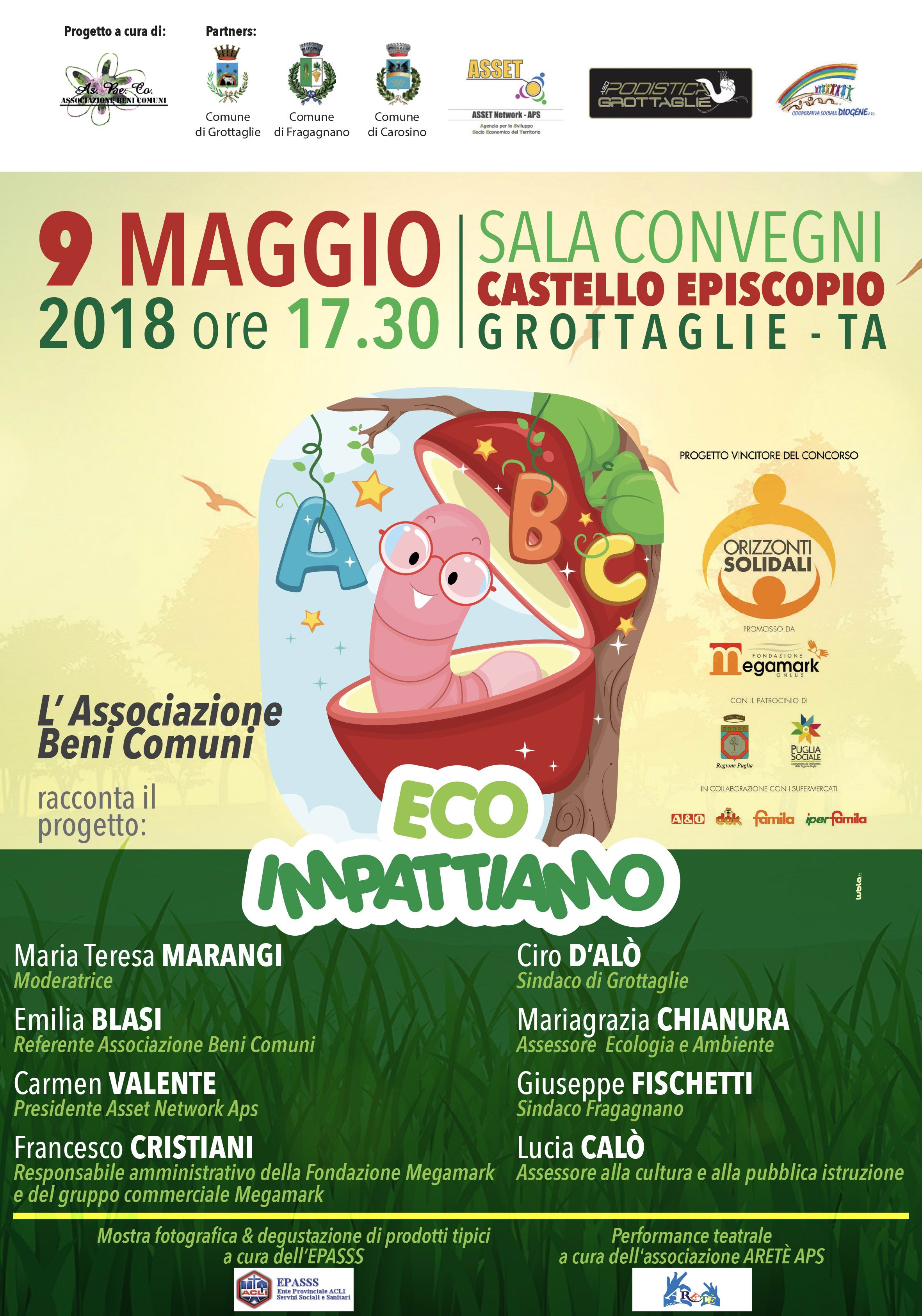 Iniziato nello scorso mese di novembre, il progetto si avvia alla conclusione e i risultati fin qui conseguiti saranno illustrati nella manifestazione “L’Associazione Beni Comuni racconta il progetto “Ecoimpattiamo”, evento che si terrà, alle ore 17.30 di domani (mercoledì 9 maggio), presso il castello Episcopio di Grottaglie.