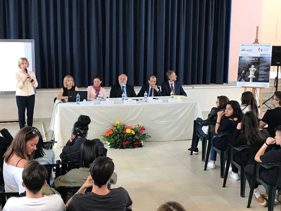 Ai saluti della dirigente scolastica, professoressa Maria Maddalena Di Maglie, che ha sottolineato nel suo intervento il valore dell’orientamento scolastico quale contributo allo sviluppo consapevole dell’allievo e della sua personalità nelle sue varie dimensioni, è seguito l’apporto della dott.ssa Maria Grazia Labellarte, in veste di moderatrice. Per raggiungere un futuro che garantisca benessere non soltanto a livello personale, ma comunitario, al fine di un rapporto sinergico e produttivo, è necessario rivolgere la nostra attenzione a pilastri formativi come la Sicurezza Nazionale, il Giornalismo, l’Università e la Diplomazia che sono stati rispettivamente rappresentati dal Dott. Giuseppe Esposito, vice presidente COPASIR e membro del consiglio per la Sicurezza della repubblica, dalla dott.ssa Francesca Musacchio, giornalista professionista de Il Tempo e direttrice del webmagazine OFCSreport, Osservatorio Focus Cultura della Sicurezza), dal prof. Nicola Neri, docente di storia delle relazioni internazionali e di storia della guerra e delle istituzioni militari e dal dott. Viktor Hamotskyi, console generale Ucraina in Italia.