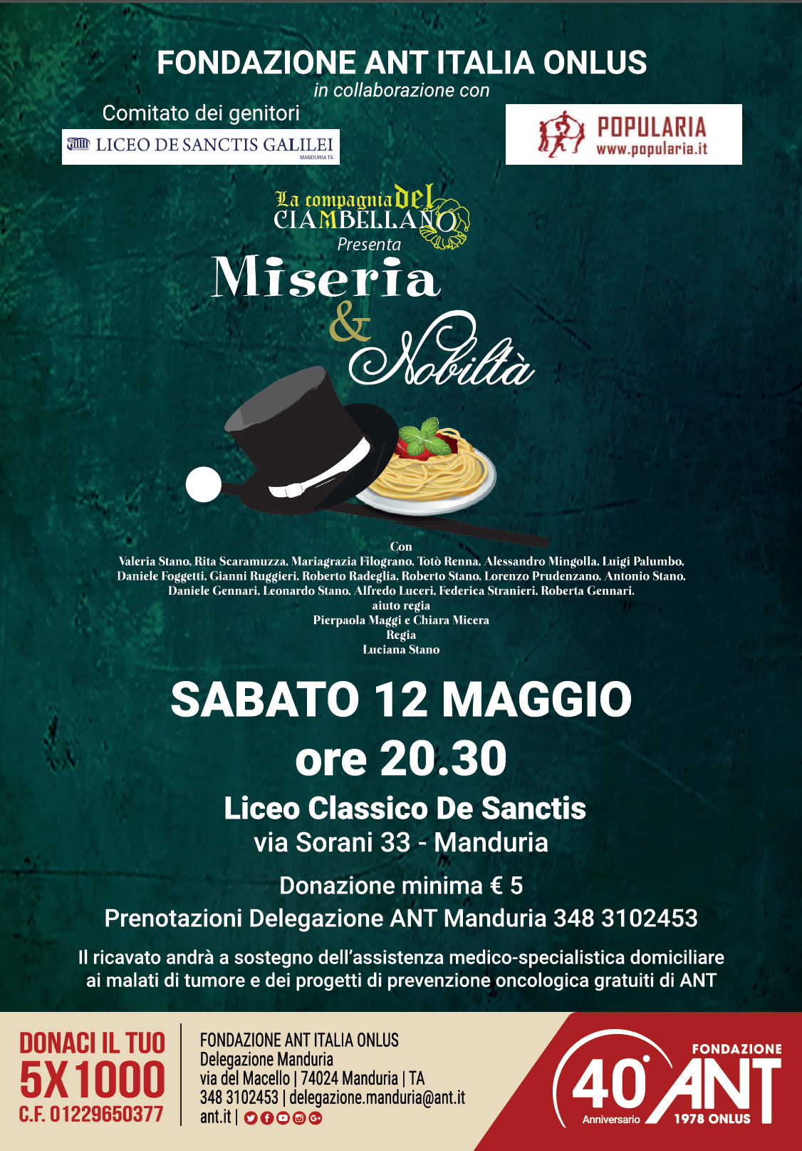 L’evento è organizzato dalla delegazione ANT di Manduria, in occasione del 40° anniversario di assistenza oncologica gratuita domiciliare, con la collaborazione della stessa compagnia teatrale, della dirigente scolastica Marilena Dimaglie e dell’associazione Popularia.