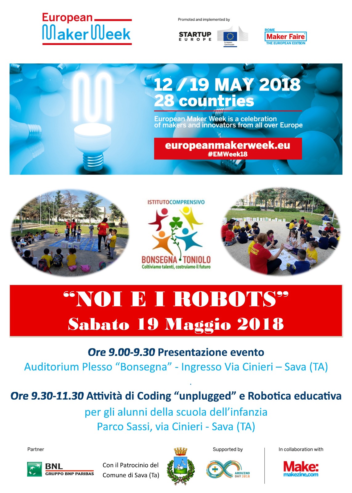 Durante l’evento “NOI E I ROBOTS”, che si svolgerà sabato mattina tra l’Auditorium del “Bonsegna” e il Parco Sassi di Sava, i piccoli makers di 5 anni, alunni delle scuole dell’infanzia del Bonsegna-Toniolo, guidati da un gruppo di insegnanti innovative e appassionate, dimostreranno le loro competenze nello svolgimento di attività di coding “unplugged” e programmeranno i piccoli bee-boot per compiere percorsi ed azioni progettati dagli stessi bambini. L’evento si presenta in assoluta coerenza con la mission che la scuola si è data di rendere i bambini protagonisti consapevoli e competenti del loro mondo, attraverso attività progettate da una comunità educativa aggiornata e innovativa. L’evento partirà da una breve presentazione da parte della Dirigente scolastica Prof.ssa Alessandra Sirsi e vedrà la partecipazione di genitori, docenti e autorità. L’evento ha ottenuto, infatti, il patrocinio dell’Amministrazione comunale del Comune di Sava.