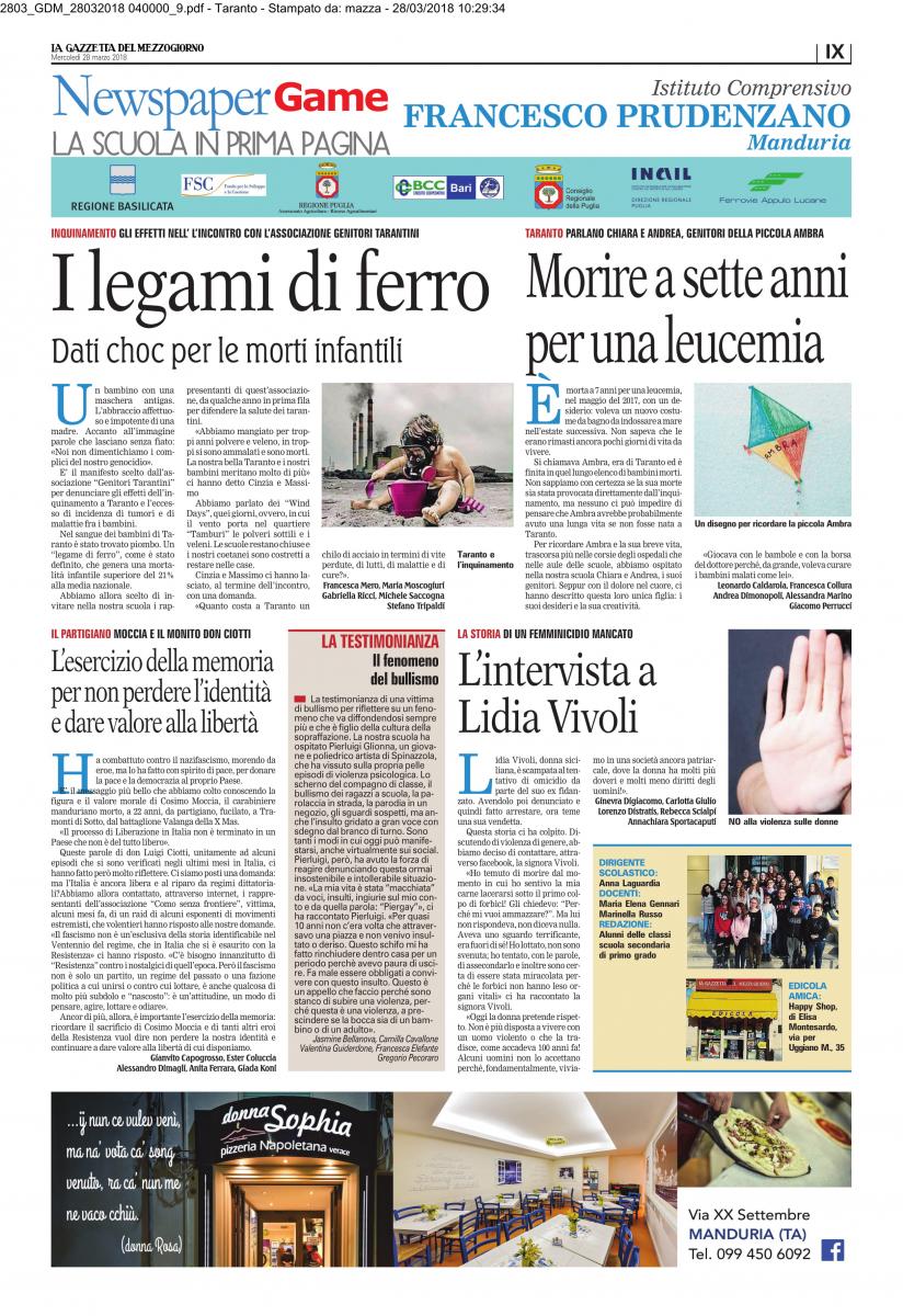 La pagina giornalistica realizzata della scuola manduriana è stata ritenuta da una commissione composta da giornalisti di Bari come la più bella e interessante fra quelle prodotte da tutte le scuole della provincia di Taranto, istituti superiori di secondo grado compresi. In una serata ricca di tanti ospiti speciali (fra questi Federica Carta, particolarmente acclamata dai circa 1.500 studenti pugliesi presenti), brilla dunque questo riconoscimento.