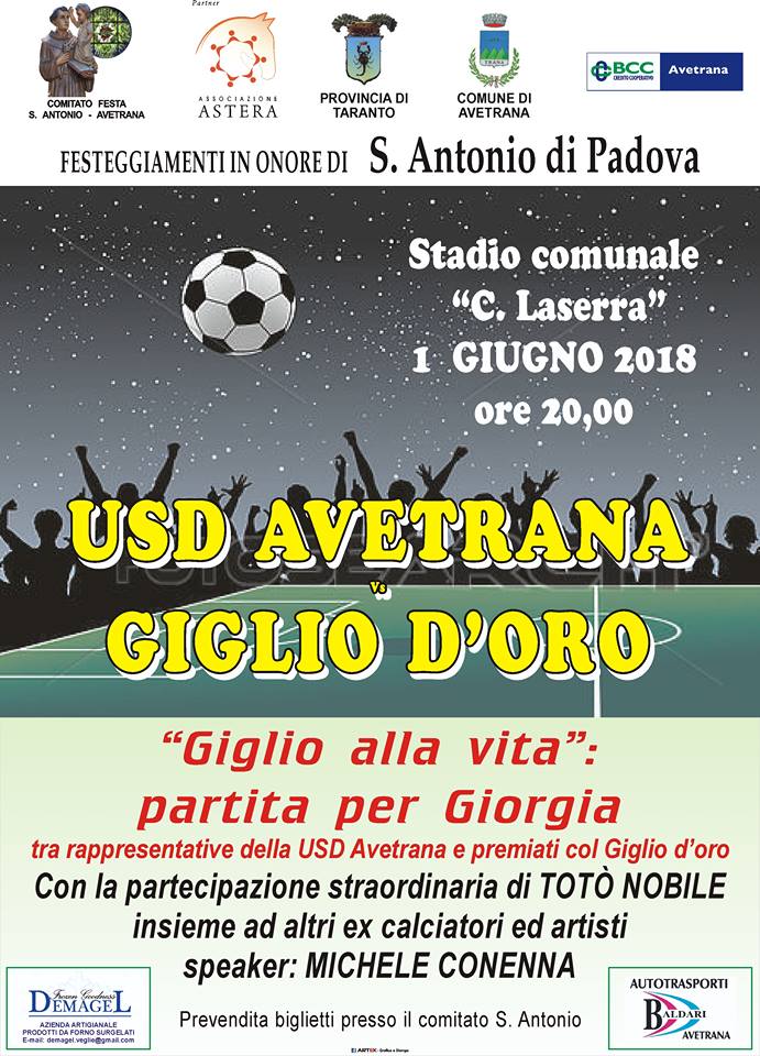 L’incontro, inserito nel cartellone dei festeggiamenti in onore di Sant’Antonio, è in programma per venerdì primo giugno, con calcio d’inizio alle ore 20. Vedrà di fronte la squadra del “Giglio d’Oro”, che annovererà le personalità che si sono fregiate, nel corso degli anni, di questo riconoscimento (fra gli altri i vigili del fuoco e i rappresentanti dell’associazione “Astera” di Ostuni) e un gruppo di calciatori della squadra locale. Hanno annunciato la presenza l’ex calciatore di Lecce e Inter Totò Nobile, l’attuale allenatore del Taranto Michele Cazzarò e lo speaker Michele Conenna.