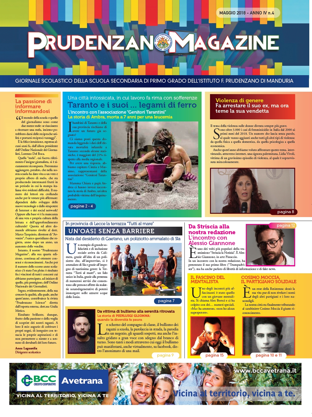 comunità scolastica e alla città domani (giovedì 7 giugno), alle ore 18, presso il Consorzio Produttori Vini di Manduria. Venti pagine, tutte a colori, che ospitano il frutto del lavoro di un intero anno dei giorni redattori e raccontano, con articoli e riflessioni, i tanti incontri che si sono succeduti in un altro affascinante viaggio.