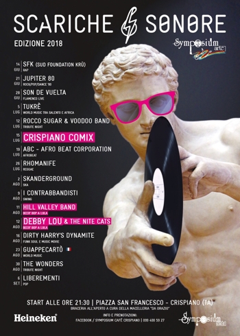 Sonore organizzata dall'associazione Symposium Arte. Dopo il grande successo di pubblico del 2017, gli organizzatori hanno ideato ancora una volta un cartellone di tre mesi che spazia tra i generi musicali più disparati. Come sempre, i concerti avranno luogo nell'accogliente piazza San Francesco, in pieno centro cittadino. Si parte giovedì 14 giugno con il rap nostrano dei Sud Foundation Krù e si andrà avanti con il consueto appuntamento del giovedì fino al 6 settembre. Ce n'è per tutti i gusti: dal rap alla dance anni '80, dal flamenco alla world music, dall'afrobeat al reggae, dallo ska allo swing, dalla music movie al pop. Confermata la due giorni rockabilly denominata Beer-Bop-A-Lula. A metà luglio, inoltre, è in programma una sorpresa musicale che sarà svelata prossimamente. Nelle precedenti edizioni la rassegna Scariche Sonore ha ospitato un gran numero di band, tra cui artisti affermati come Erica Mou, Cesare Dell'Anna, la Municipale Balcanica e i Don Diego Trio.