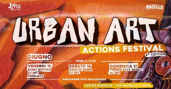 L’ Urban Art Actions Festival inizierà il 15 Giugno alle ore 17.00, con lo start ai lavori dei writers scelti e selezionati in tutta la provincia e non solo, che, come lo scorso anno, saranno impazienti di riempire con i loro disegni le mura interne di via Macello, 1. Mentre i primi schizzi degli artisti prenderanno forma, sarà possibile gustare una fresca birra e la grigliata, e restare incuriositi da un piccolo mercatino di artigianato.