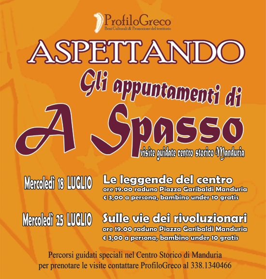 Ogni visita guidata avrà inizio alle ore 19 da piazza Garibaldi in Manduria, con un contributo di partecipazione di 3 euro a persona, mentre la partecipazione di tutti i bambini al di sotto di 10 anni è gratuita (per ulteriori informazioni è possibile contattare gli organizzatori o attraverso il portale www.profilogreco.it o telefonando al numero 3381340466).