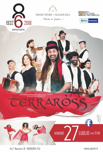 La serata avrà come consueto il momento di spettacolo, quest’anno a cura dei Terraròss, suonatori e menestrelli della bassa Murgia, la loro è una musica che profuma di Sud, che attraversa i campi d’ulivo, i vigneti, le piantagioni di tabacco, musica che dalle alte cime del Gargano, viaggia attraverso la Murgia per toccare il Salento e per poi, infine arrivare al mare.