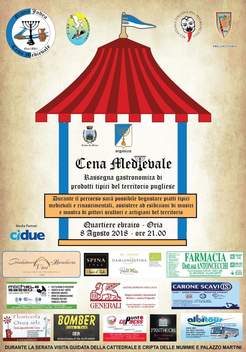 La Cena Medievale è organizzata dal Rione Judea con il patrocinio della Città di Oria, della Pro Loco di Oria, dell’Accademia del Peperoncino e della ProcivArci di Oria.