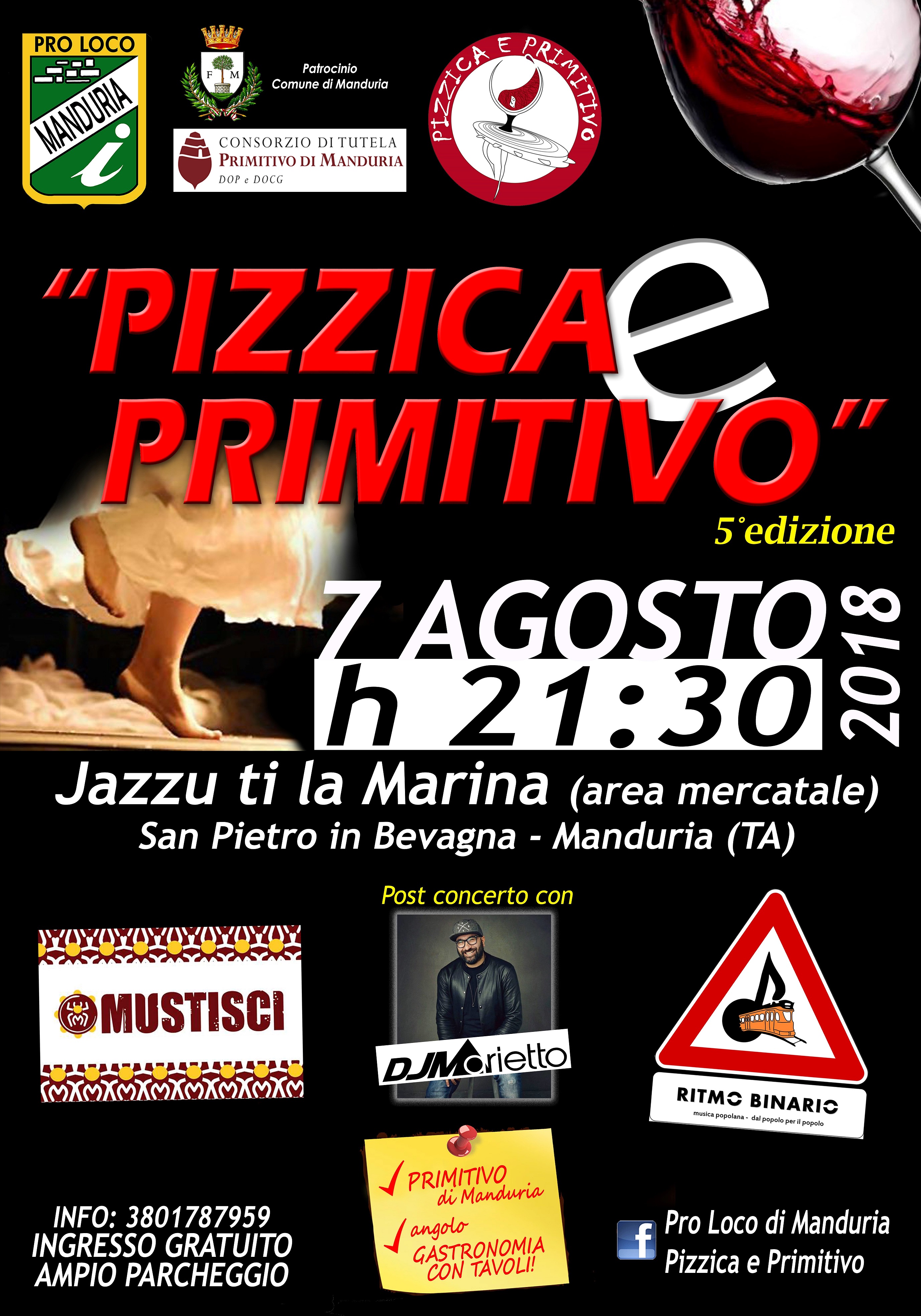 Su iniziativa della Pro Loco di Manduria e grazie al patrocinio del Comune di Manduria, questa sera, nell’area del mercato settimanale della marina manduriana (jazzu della Marina, fra San Pietro in Bevagna e Torre Borraco), avrà luogo la quinta edizione di “Pizzica e Primitivo”, rassegna capace di calamitare migliaia di persone.
