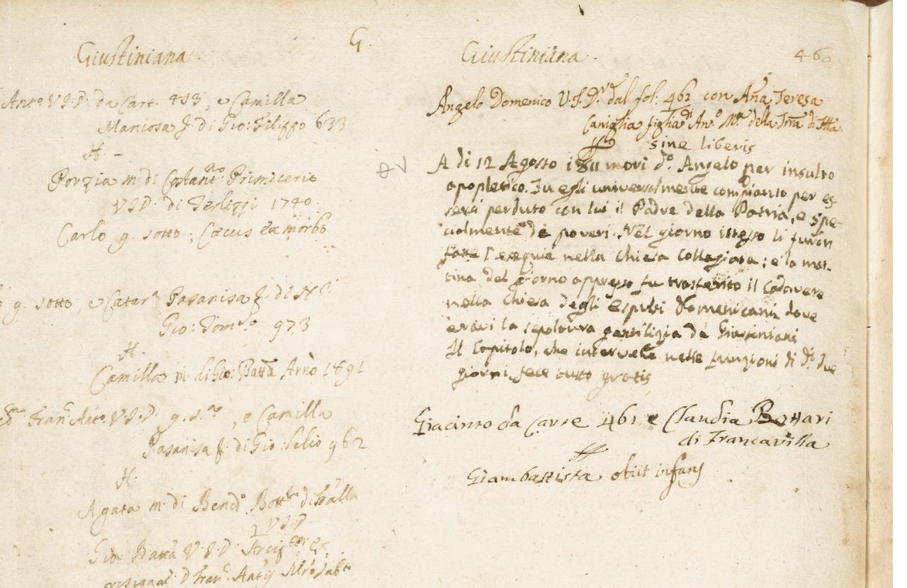 “Angelo Domenico UJD... A dì 2 Agosto 1811 morì D.co Angelo per insulto apoplettico. Fu egli universalmente compianto per essersi perduto con lui il Padre della Patria e specialmente de' poveri. Nel giorno istesso li furono fatte l'esequie nella Chiesa Collegiata, a la mattina del giorno appresso fu trasferito il cadavere nella chiesa degli Padri Domenicani dove trovasi la sepoltura gentilizia de' Giustiniani. Il Capitolo che intervenne nelle funzioni de' due giorni fece tutto gratis.” [6].